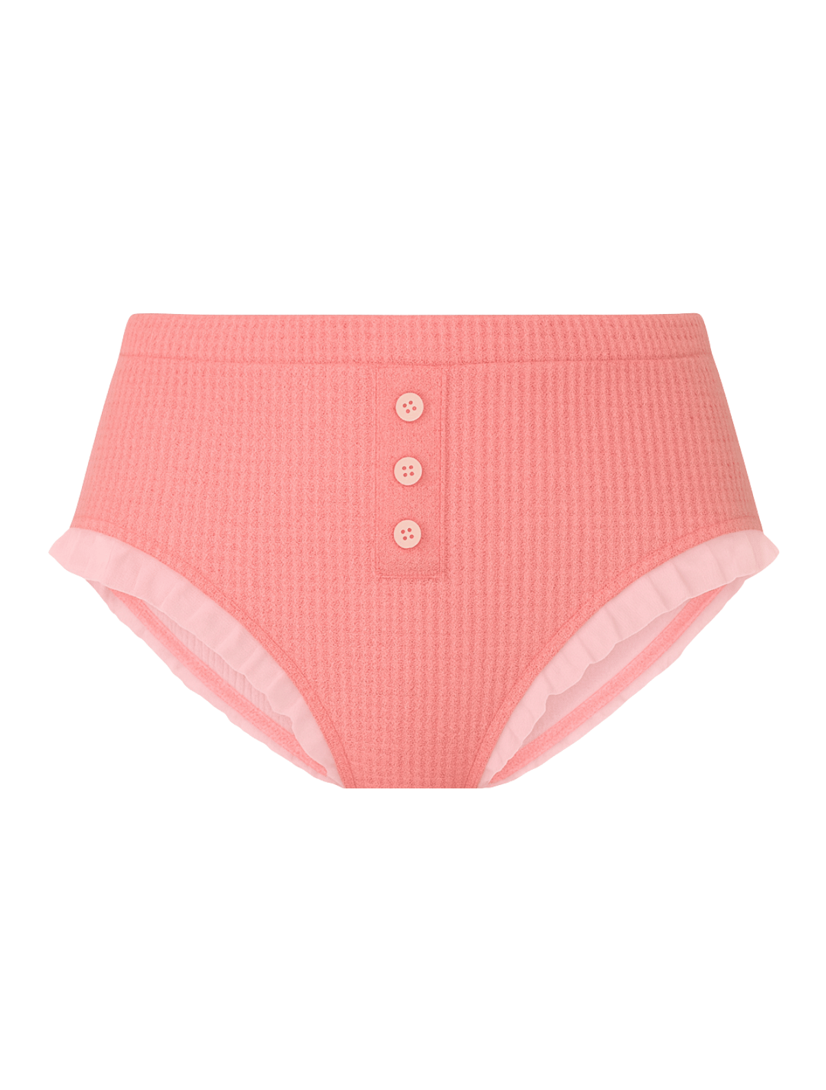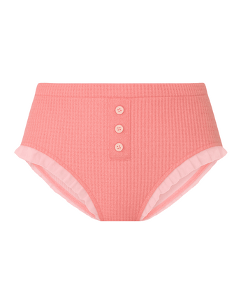 The Pink Pad-Friendly shorts include soft, modal-lined waffle briefs with built-in underwear, featuring winged pad capabilities and double-layered protection. Button and frill details add just the perfect touch of femininity to make you feel the cutest on your cycle.