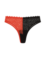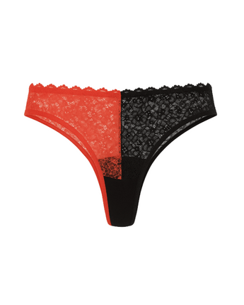 The best of both worlds - with vibrant red and black split panels and delicate, stretchy lace. Includes a 100% cotton liner.