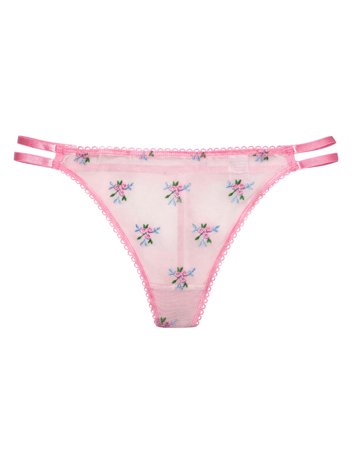 It's like a flirty mix of fun and elegance featuring adorable pink florals, dainty trim, and a trendy double-strap waistband, all wrapped in one!