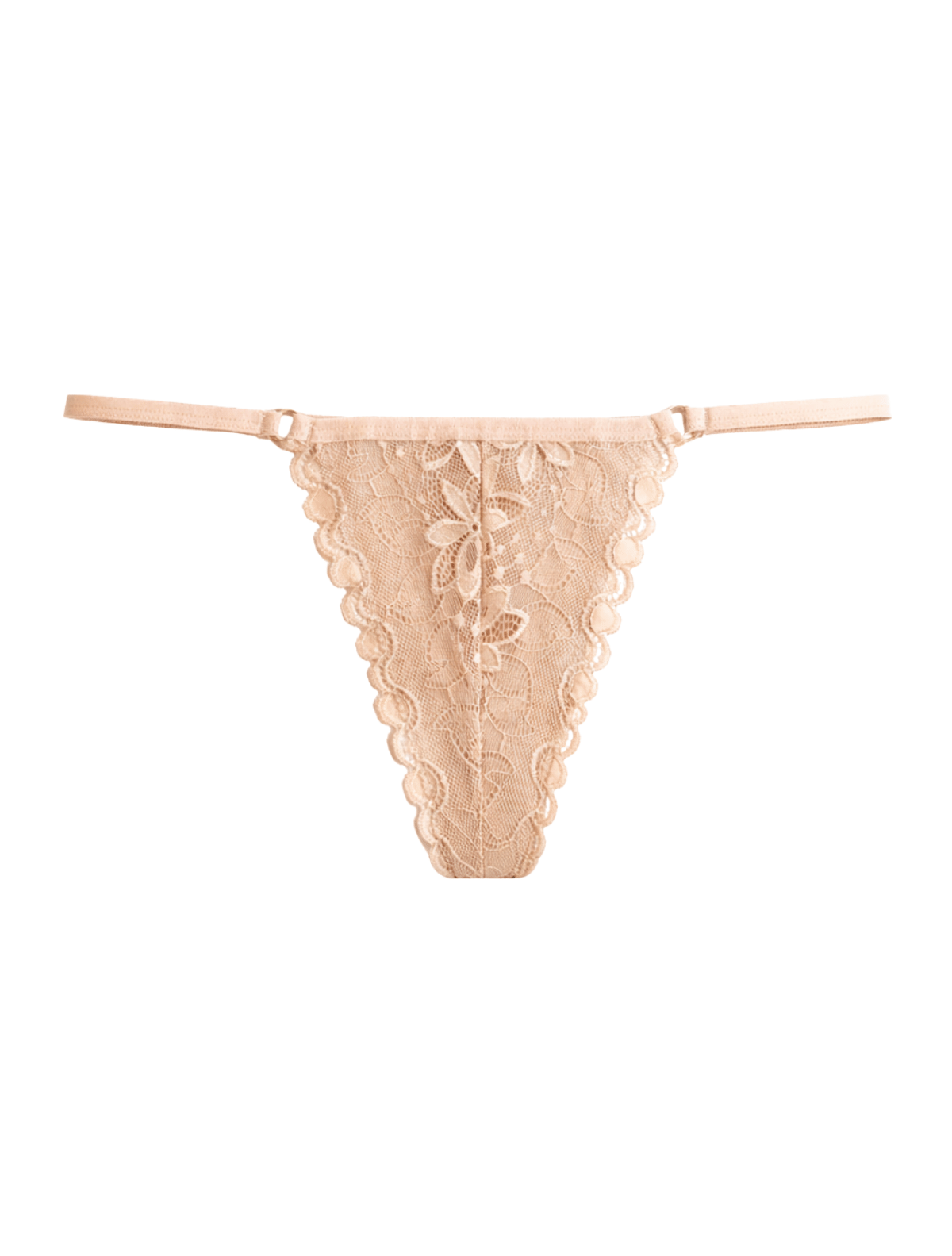 Delicate on the outside, comfortable where it counts. The Scalloped Lace Nude Thong features intricate floral lace with a smooth lining for added coverage and comfort. Finished with a scalloped edge and slim, stretchy straps, it offers a flattering, barely-there fit that feels as good as it looks.