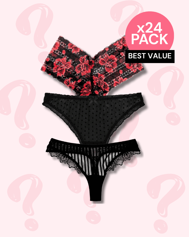 Each pack is a surprise assortment, so styles may vary from the images shown. Mystery bundles include a mix of silhouettes, with no guaranteed ratio between thongs and non-thongs. That’s part of the magic ✨