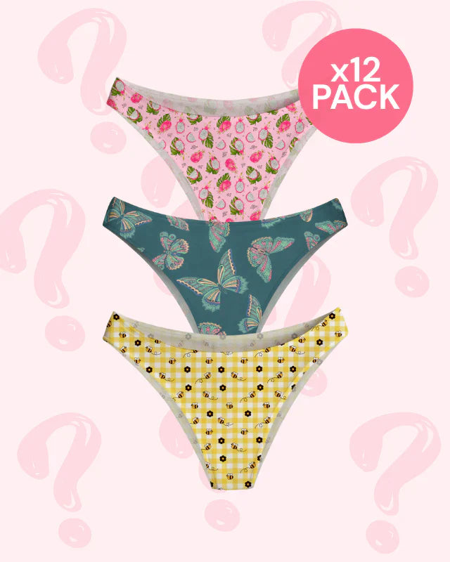 Each pack is a surprise assortment, so styles may vary from the images shown. Mystery bundles include a mix of silhouettes, with no guaranteed ratio between non-thong styles. That’s part of the magic ✨