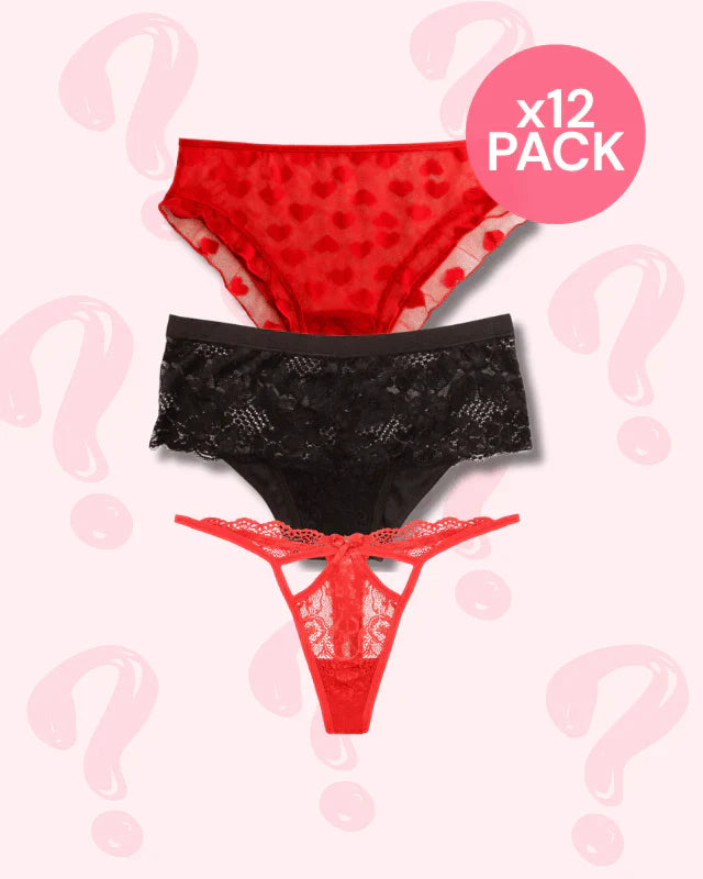 Our Mystery Lace Lovers 12-Pack includes twelve of our favorite lacey underwear styles in a curated selection. You place the order, we do the picking—easy, fun, and totally unexpected.
