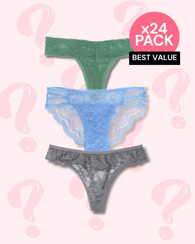 Our Mystery Lace Lovers 24-Pack includes 24 of our favorite lacey underwear styles in a curated selection. You place the order, we do the picking—easy, fun, and totally unexpected.
