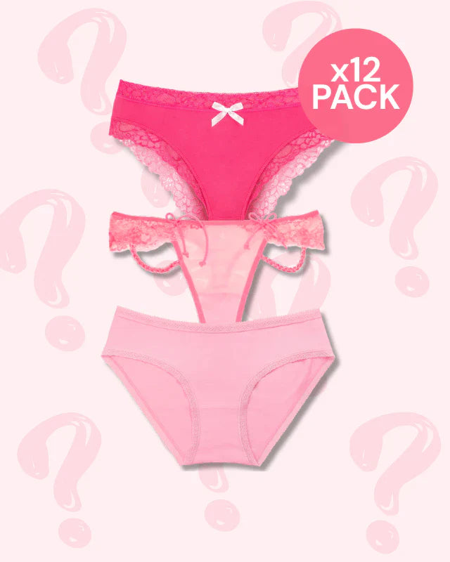 Our Mystery Pinks 12-Pack includes twelve of our favorite pink underwear styles in a curated selection. You place the order, we do the picking—easy, fun, and totally unexpected.