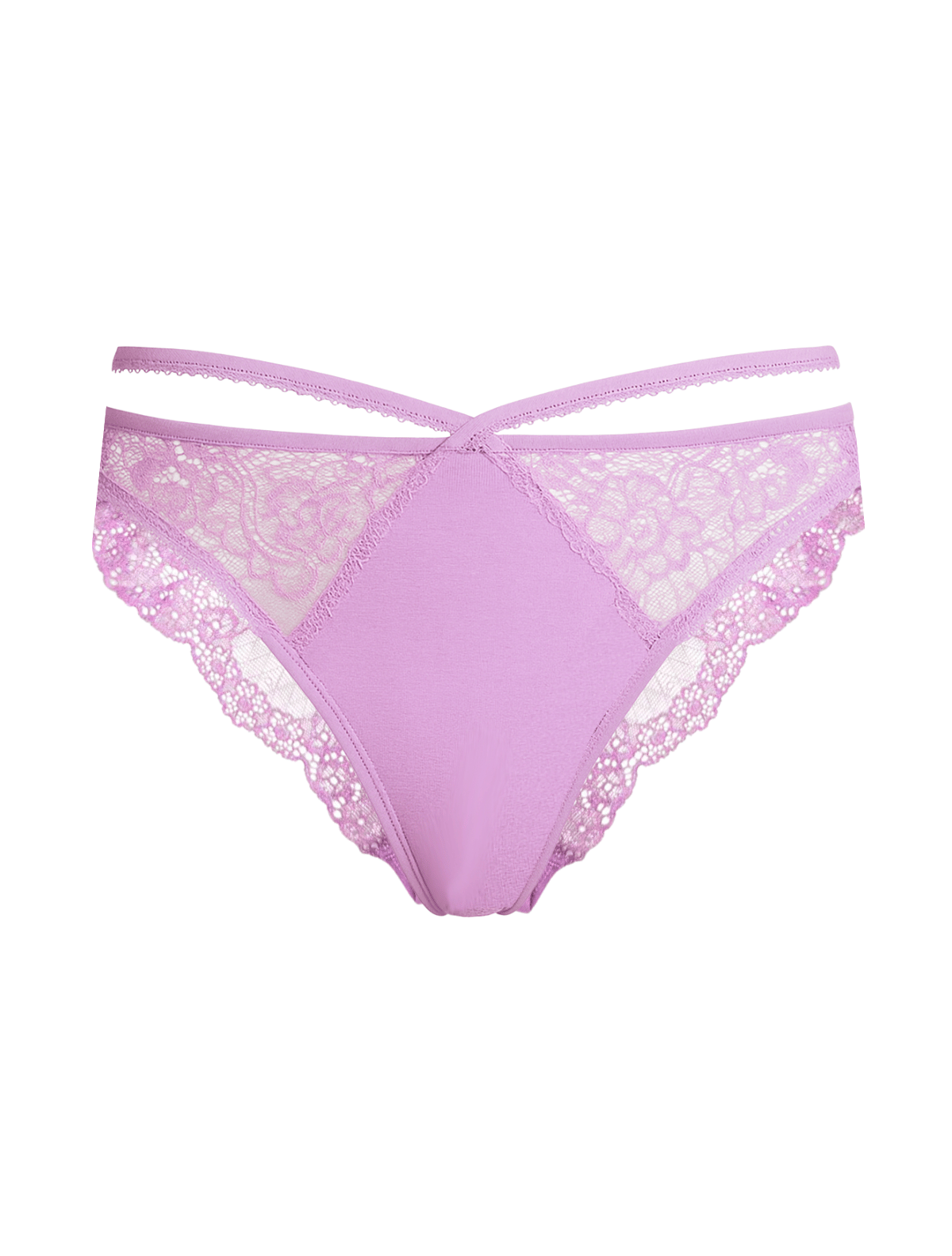 Lucious lilac, cheeky lace-bum undies with adjustable straps that you can wear on the waist or hips! Made with stretchy lace, so soft that you'll forget you have them on!
